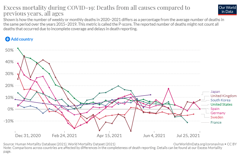 新型コロナウィルスによる過剰死亡率 多くの国が減少する中で日本が上昇に向かい北半球で最大に