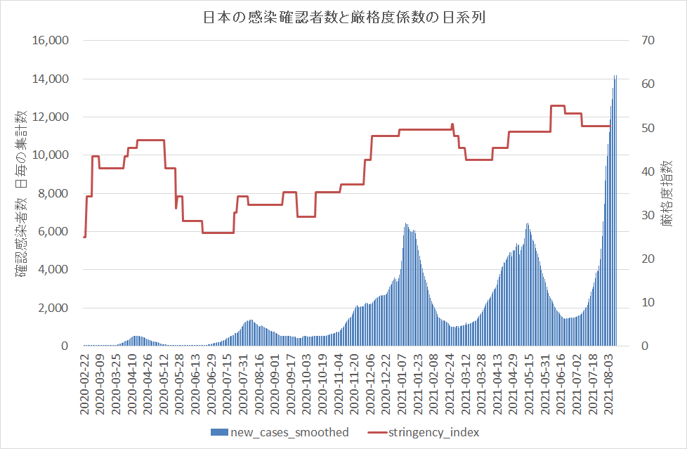 下のグラフは感染陽性確認者数と厳格度指数の日系列の推移を描いたものである。
