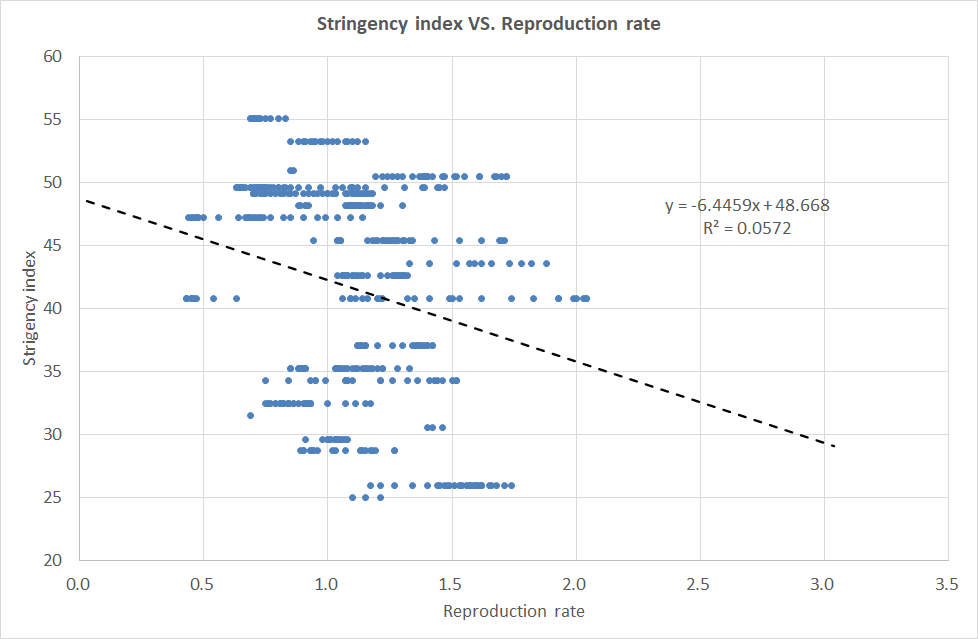 強いて見れば、厳格度指数50%程度で再生産者率がゼロになるように見えるが、統計的信頼度は殆ど得られない。