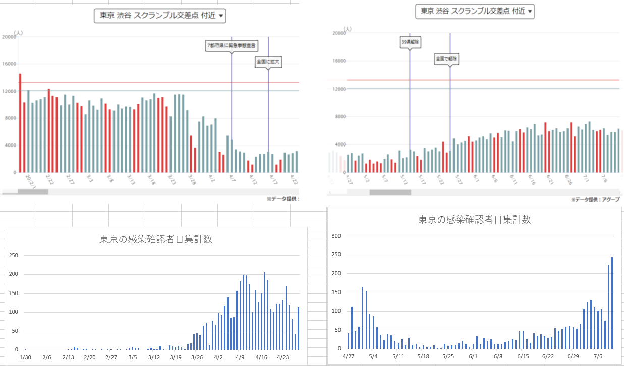 新型コロナ COVID-19 東京の感染確認者数と渋谷交差点の通過人口の日ごと集計値の関係