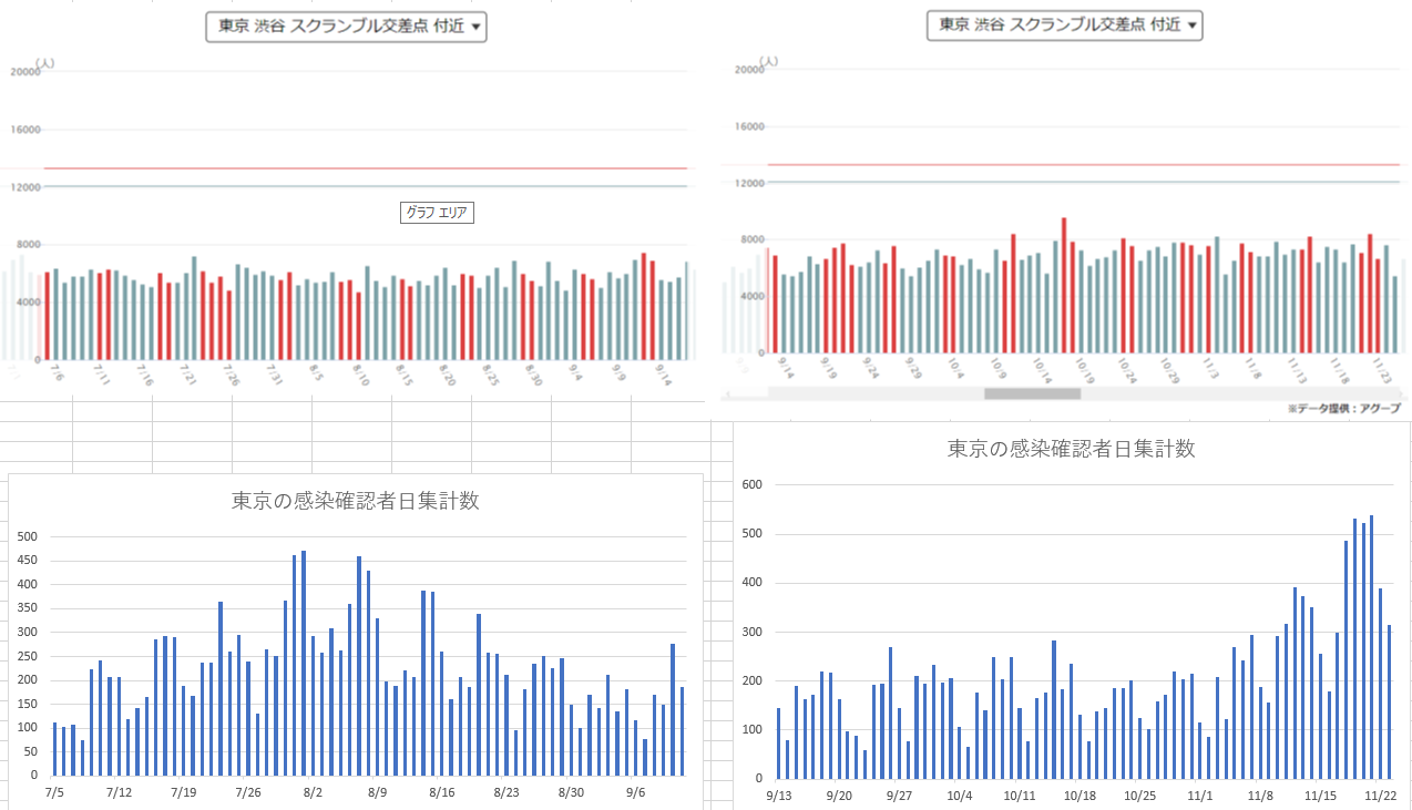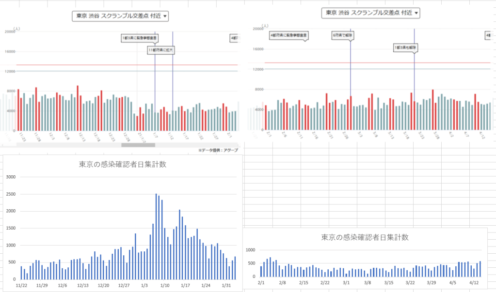 渋谷の交通量データはNHKが「アグープ」社から購入したものと思われグラフ画像のみ、数値データのダウンロードが公表されていないので以下の組みグラフは出来るだけスケールがそろうよう伸縮して並べたものである。