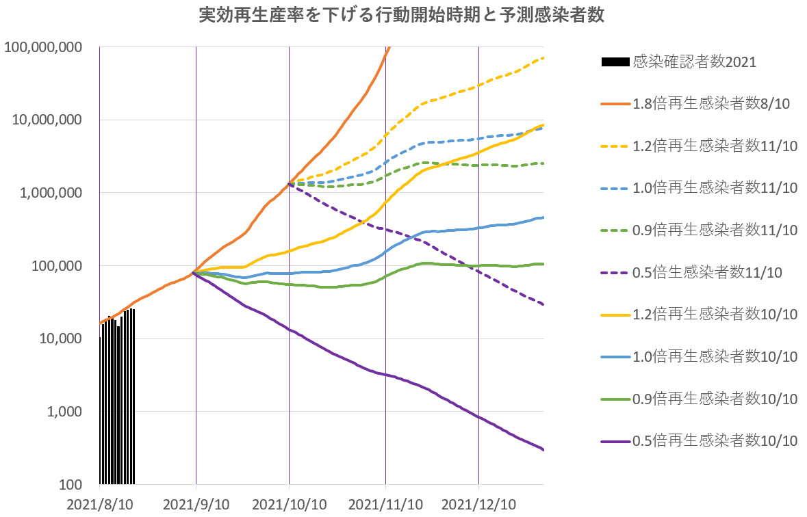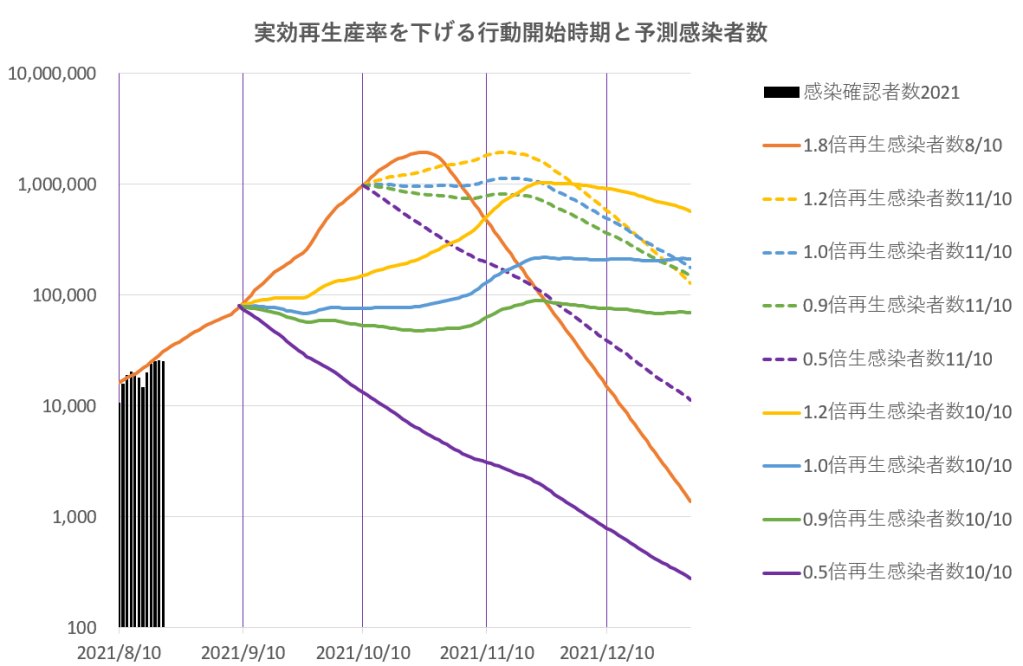 感染対策を強化して昨年と同じ程度の感染再生産率に戻しても感染者数の増加は収まらない。感染を収束させるためには昨年の半分になる強力な感染防止実効対策とそれを即時行うことである。