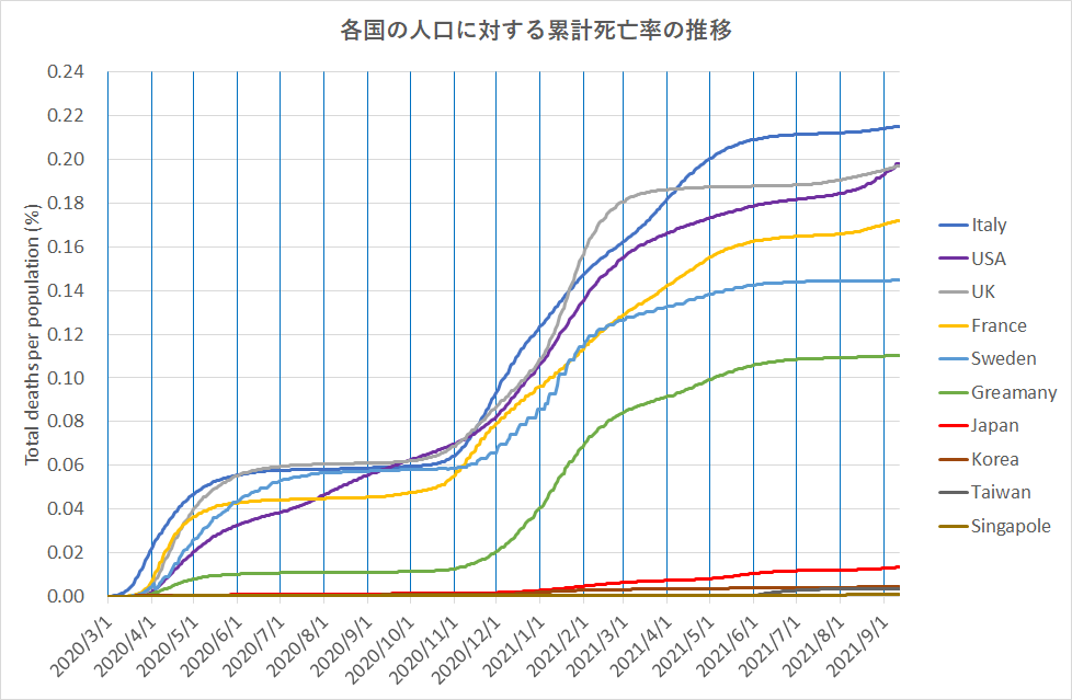 日本は、感染防止対策が厳しい韓国、台湾、シンガポールに比べれば死亡率が2倍ほど大きいが、欧米諸国の十分の一程度である。政府の感染対策が大きく異なったスウェーデンとドイツでもその差異はわずかである。発生初期を除けば死亡者の増加は中・高緯度地方では12月~1月に起こっているが熱帯に近い台湾、シンガポールでは見られない。このことから、季節性効果とも見える。