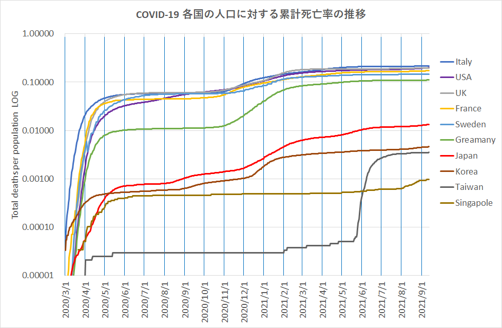 大陸から離れた西太平洋沿岸の4ヶ国、日本、韓国、台湾、シンガポールは、死亡者が欧米より1桁あるいは2桁少ないことが分かる。