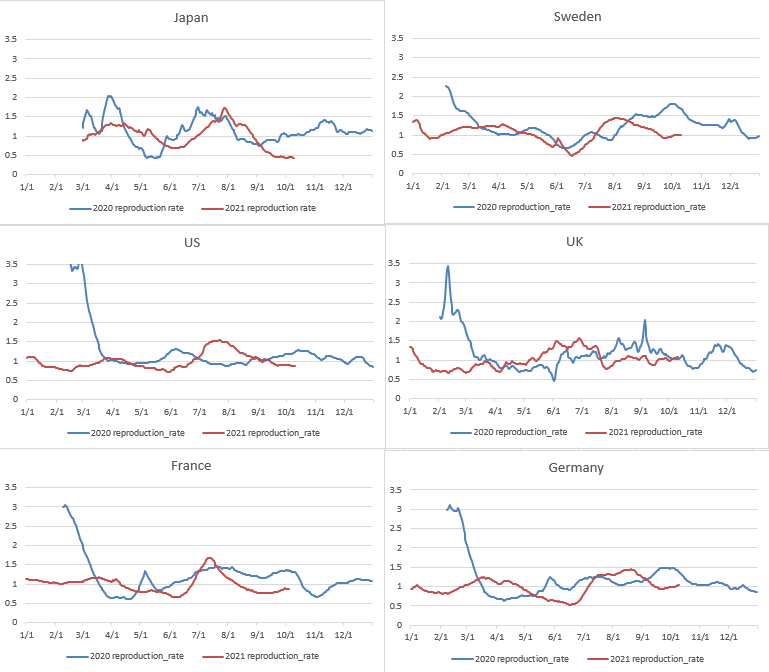 日本では今年9月頃から再生産率が0.5を切っている。このまま続けば、今回のコロナ災いは世界に先駆けて収束に向かう条件がそろったことになる。そう望みたい。