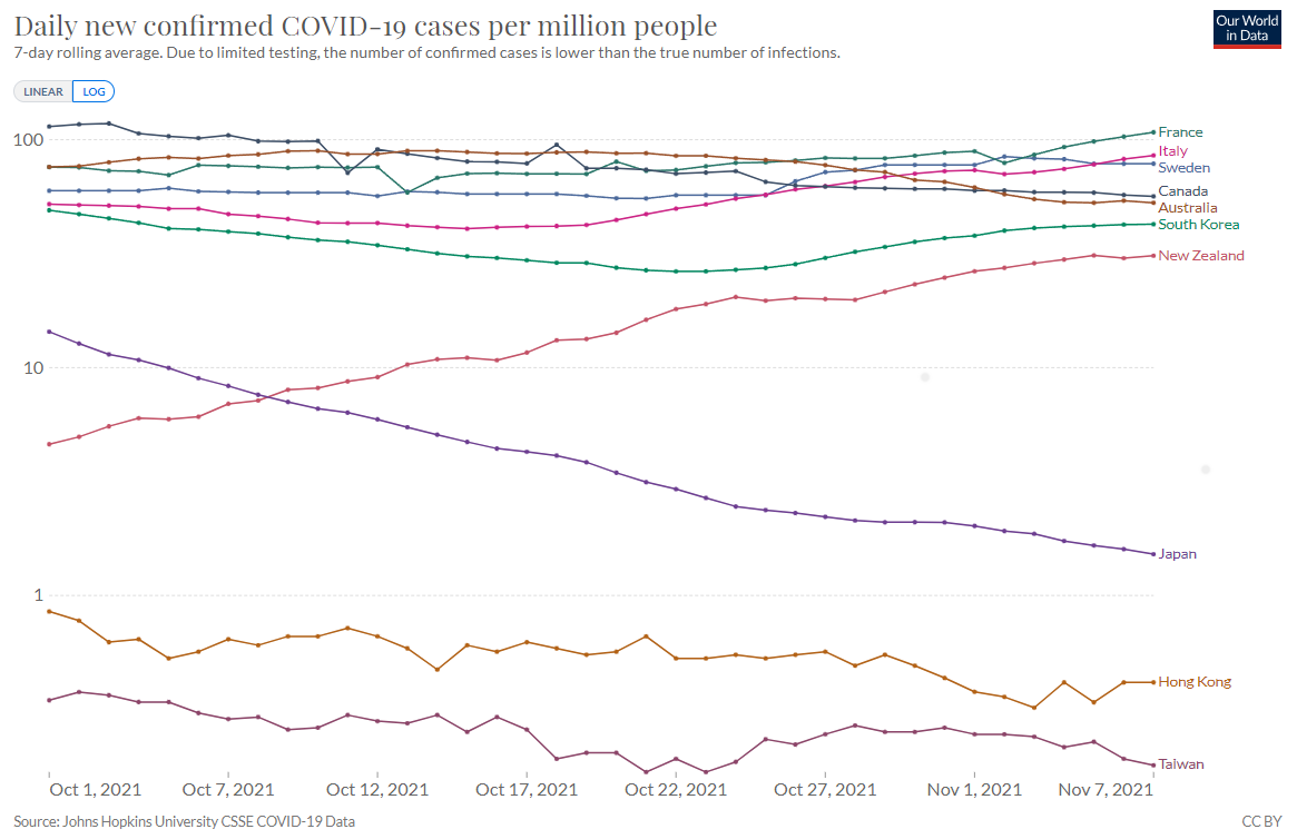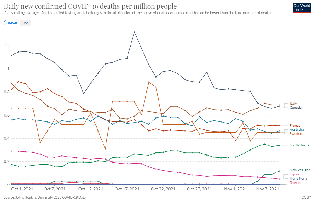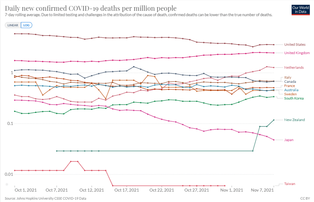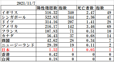 下図のグラフは 2021/10/1~11/7までのグラフの感染確認者数と死亡者数の推移をコピーした。何れも人口百万人あたりの数に換算したものである。