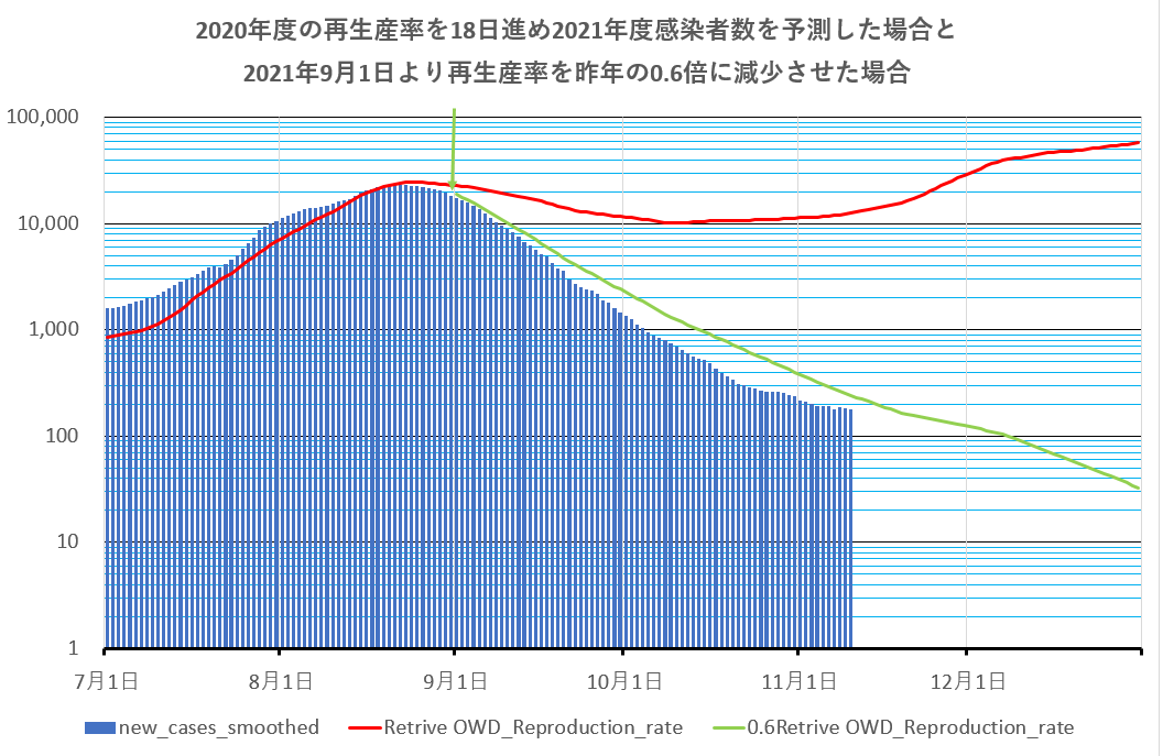 私、退職した地球物理研究者の予測。OWDデータベースを基に。赤線は2020年度の再生産率よりの2021年予測、緑線は2021年9月1日より昨年の再生産率を0.6倍に減少させた場合。
