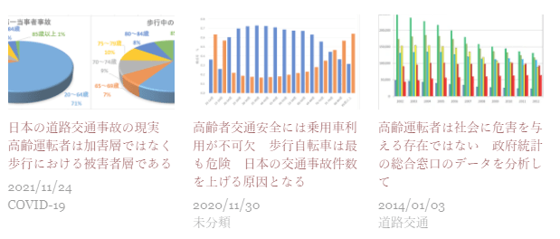 日本の道路交通事故を減らすのは、歩行者、自転車交通の安全を守る道路構造と信号の完備、高齢者の乗用車移動を容易にすることである(運転・同乗を問わず)。高齢運転者だけを悪者にしても総合事故件数は減少することはなく増加することを表している。