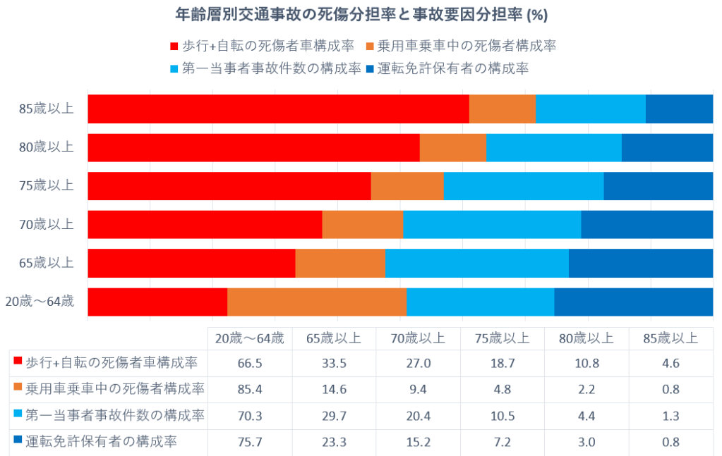 上の分析では19歳以下のデータを含めていない。したがって交通事故全体の中での、歩行+自転車、乗用車同乗の死傷事故分担率はこの表よりもっと大きくなる。