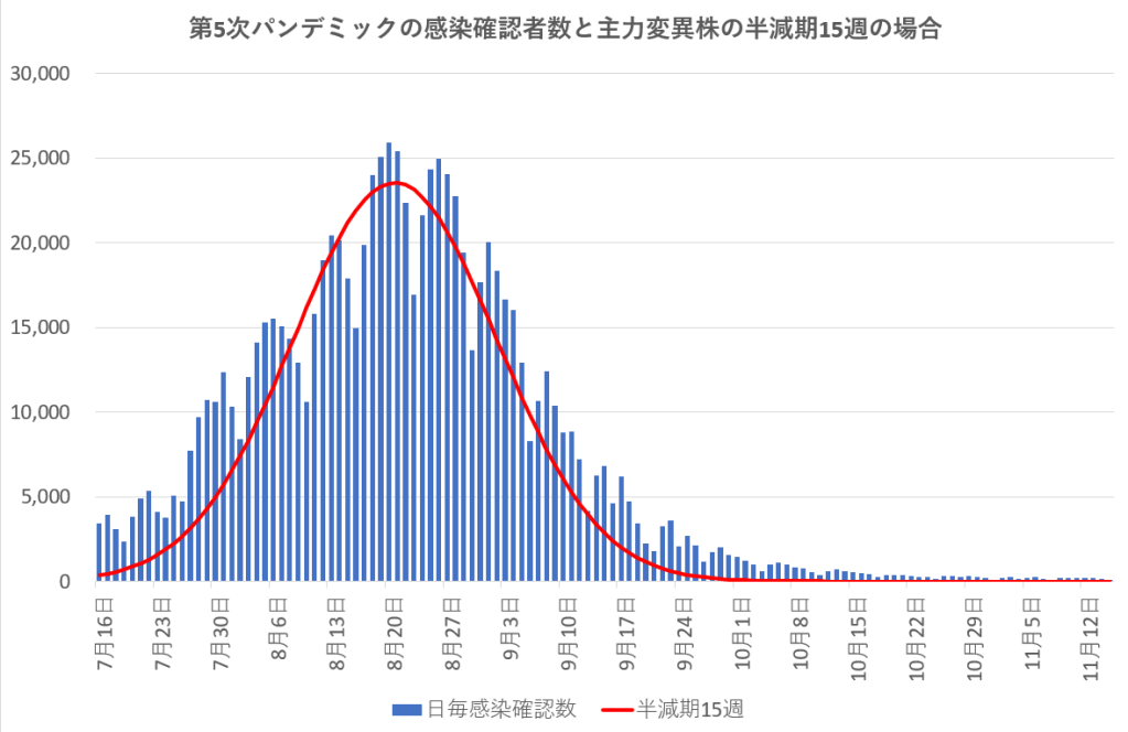 下のグラフは、この考えに基づき日本の第5次の感染増減に適用した様子を示す。