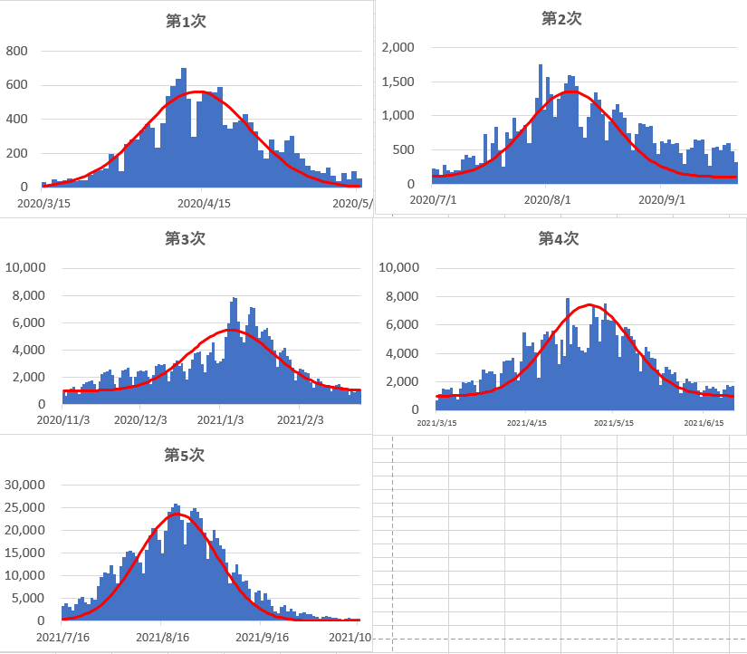 先のブログで提案した感染爆発と収縮が、それに関与した変異株の遺伝子コピーミスによる消滅によるとした場合について、日本に於ける第1次から第5次までの感染変動で試算し感染確認者数の日変化と比べてみた。