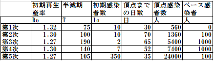 計算に用いた3っつの定数、初期簡易再生産率、ウィルス変異の半減期(日数)そして初期感染者数(人)を下表に示す。ベース感染者と記した人数は、変動に関わらない陽性者とみなした部分である。