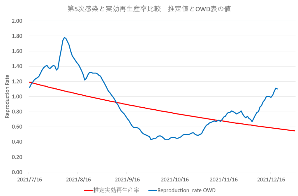 上記で用いた推定再生産率とOWDデータベースのreproduction_tate値との比較。