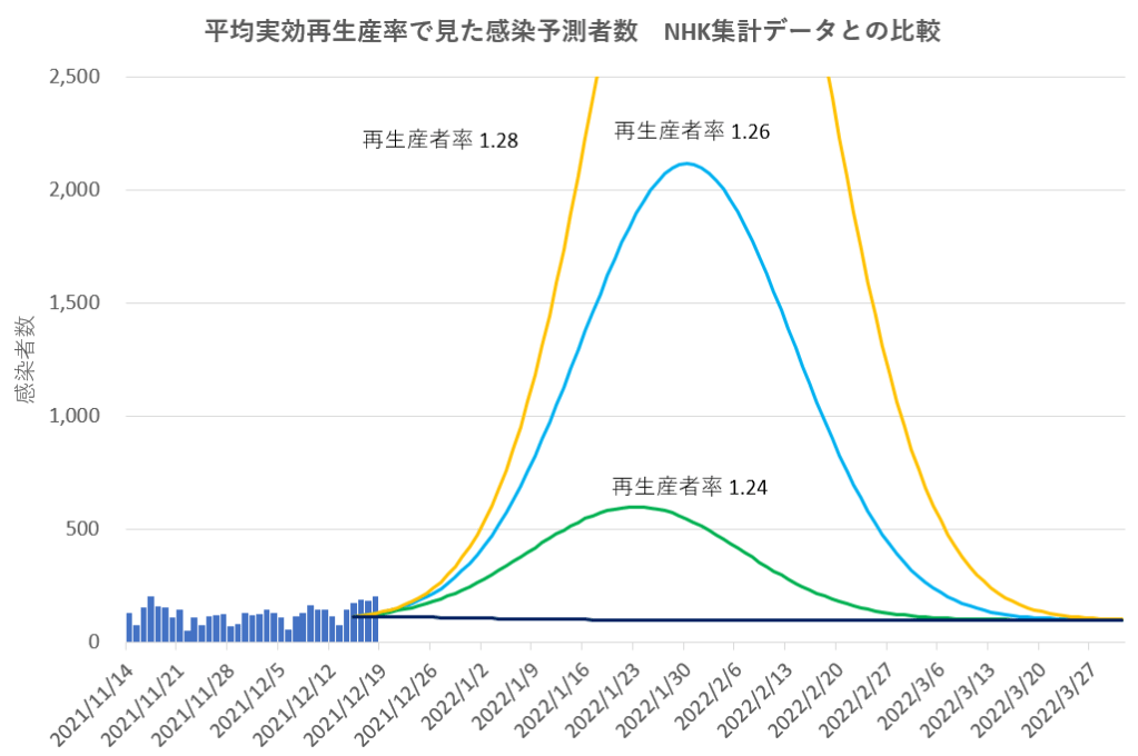 予測計算式は前のブログ記事と同じであるが確認感染者数はNHK集計による値。