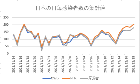 の本で公表されている日毎感染確認者数とOWDの集計値とはわずかではあるがずれがある。