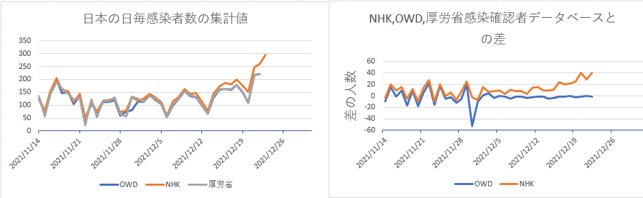 厚労省とNHK、最近開きが大きくなってきているように見られる。OWDのデータベースは厚労省のデータを基にしているとみられる。