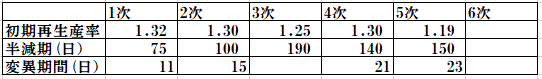 このようなことから、私が近似した日本の第1次から5次までの終息カーブから求めた変異ウィルスの半減期を用いて変異の日間隔を計算してみた。その結果を下表に示す。