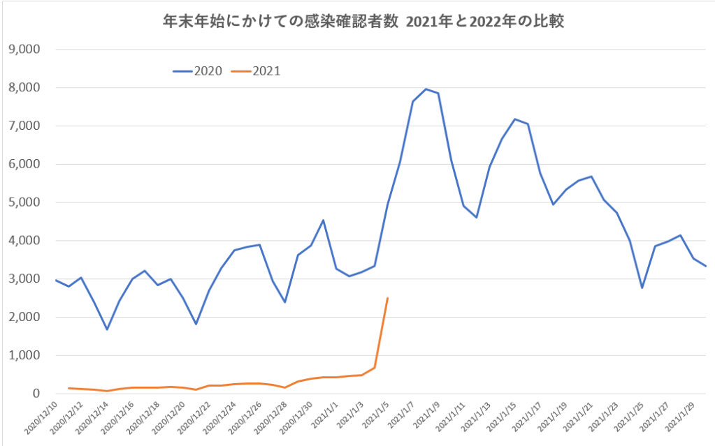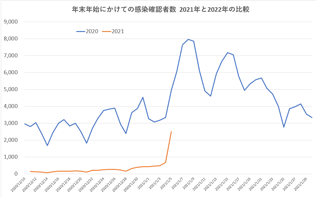 昨年同期の感染確認者数と比べてみた。同一曜日を重ねて表示した。青線が昨年、オレンジ線が今年。