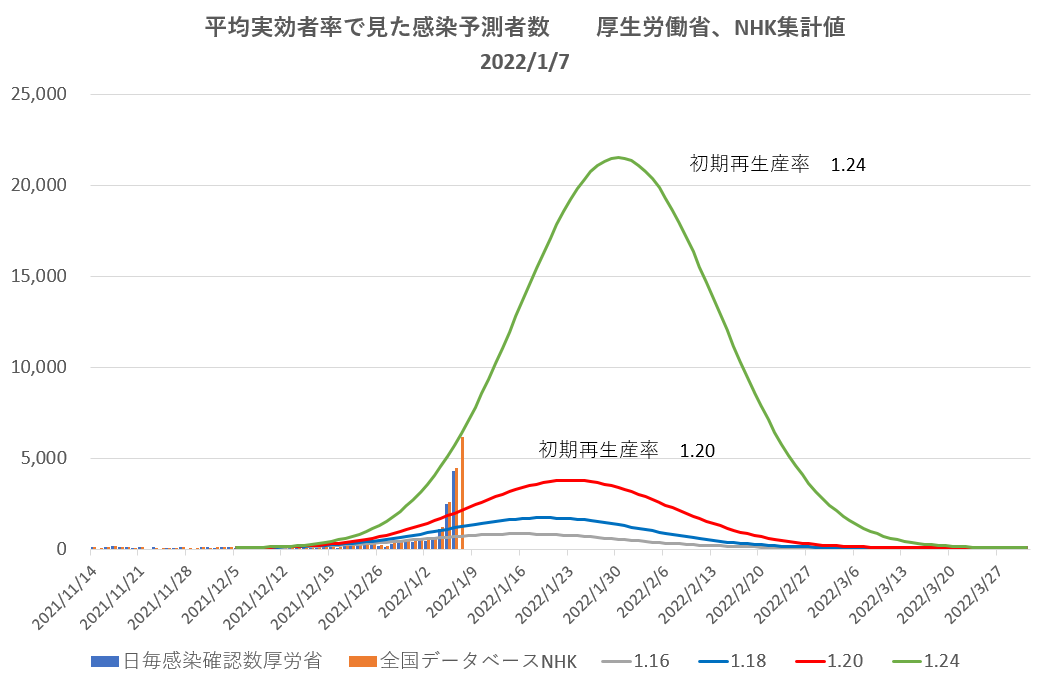第5次までの感染者近似カーブと重ねてみたグラフ。