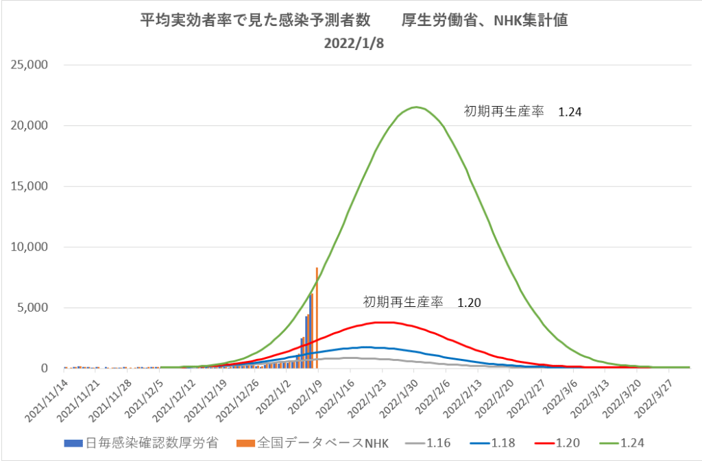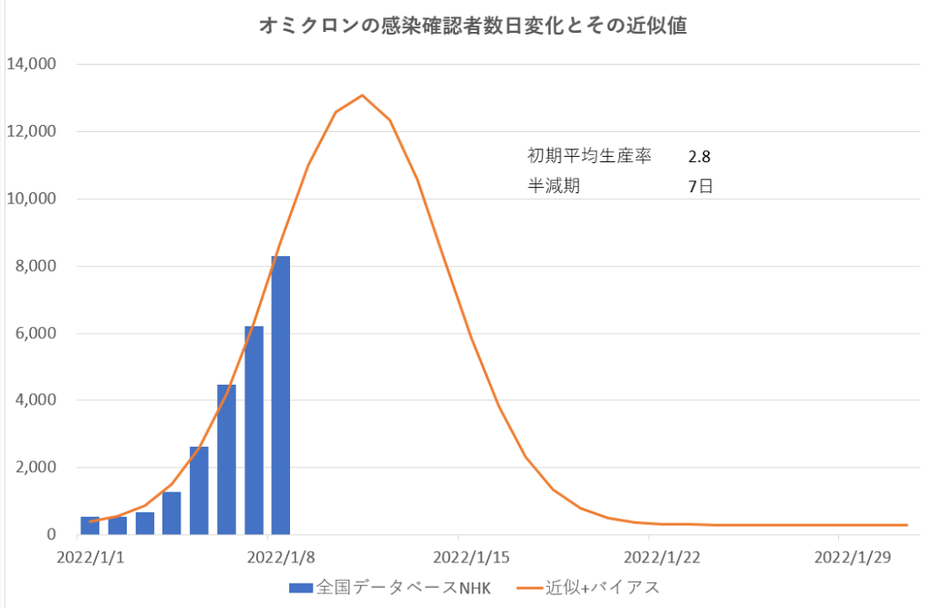 オミクロン株の感染力の強さは本当だろう。ただこの近似カーブは半減期7日で計算したもの、この変異株がこんなに短寿命であることが本当であることを祈る。