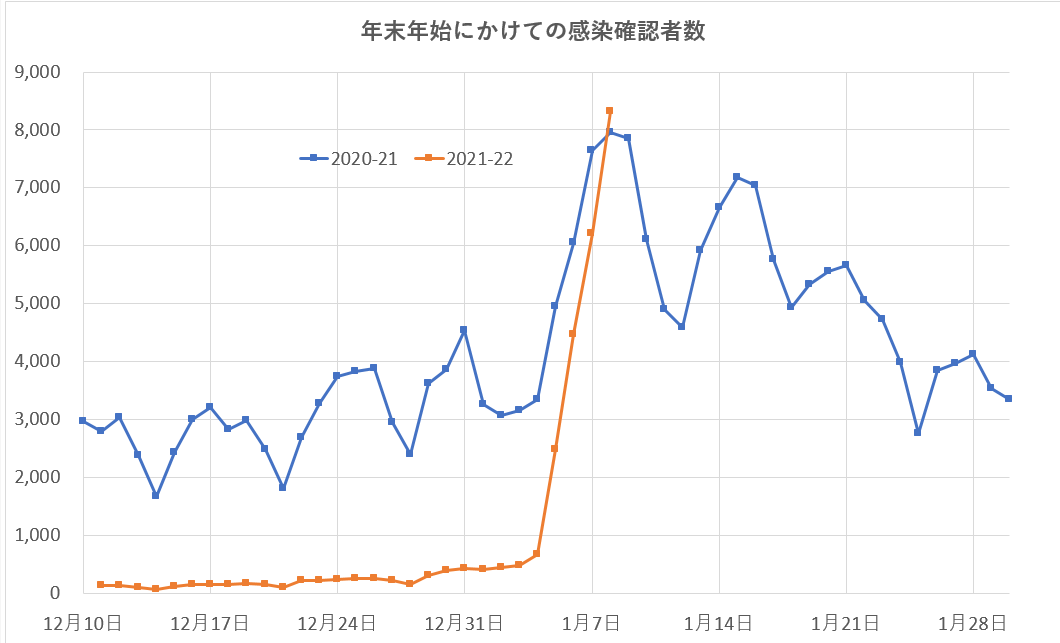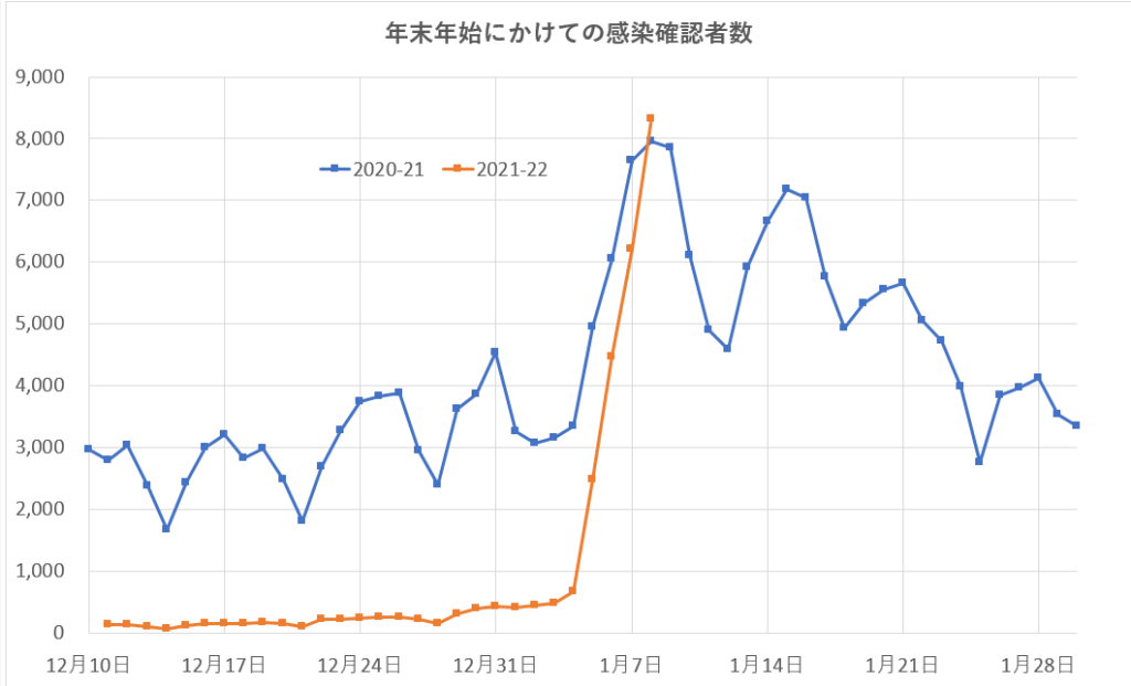 感染確認時期が年末年始にあたり、人々の社会的接触条件が異なる時期の集計値であることに注意しよう。