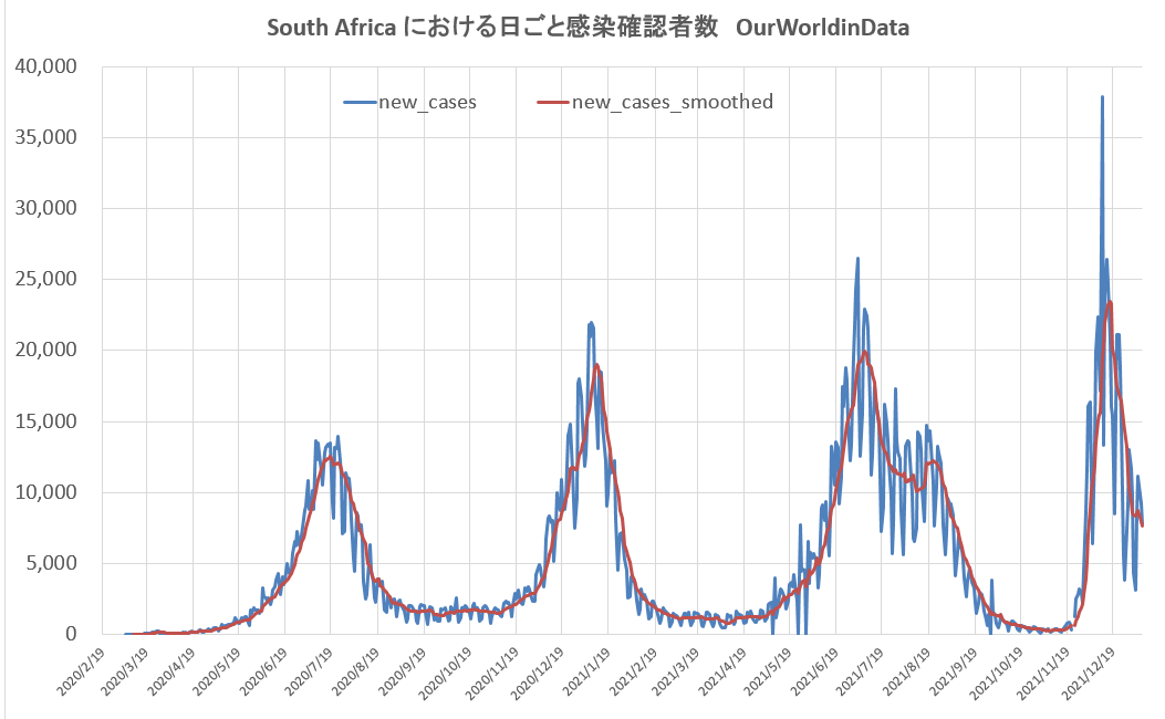 下のグラフはOWDによる日毎感染確認者数と平滑化曲線である。第4次感染の拡大率は非常に大きいが
