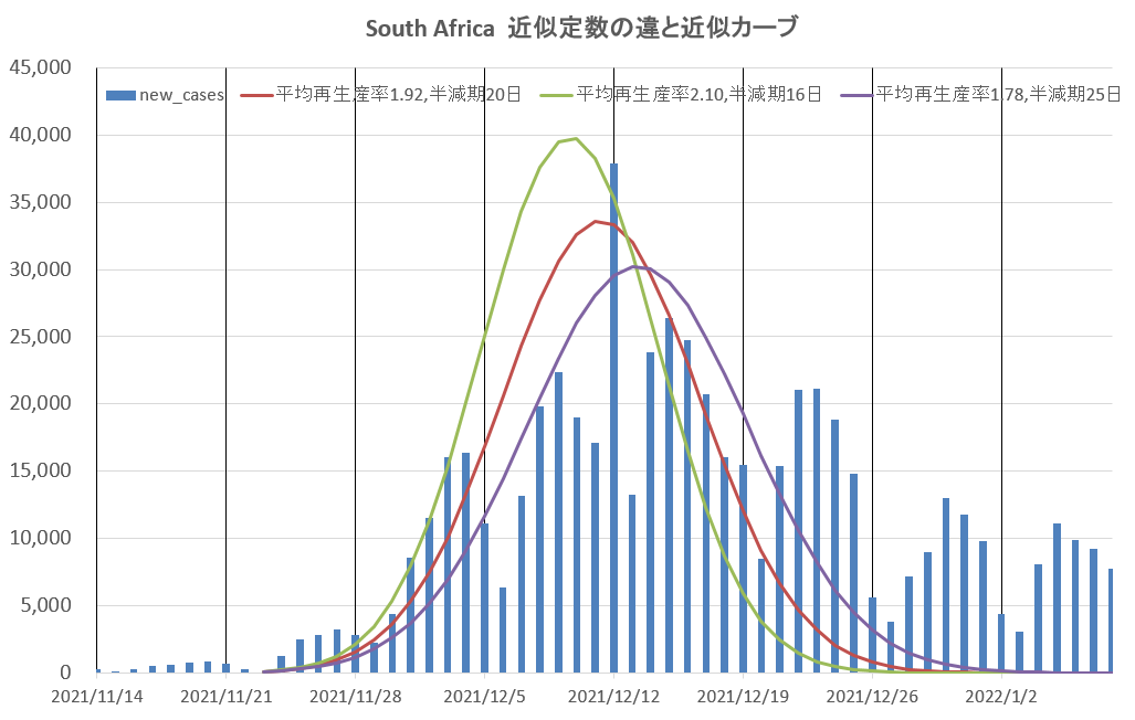 これで見る限り、実行再生産率の初期値は1.78~2.10と比較的大きく、変異株の減少半減期は16~25日と以前に見られた病変変異株に比べ短いことは確かなようだ。