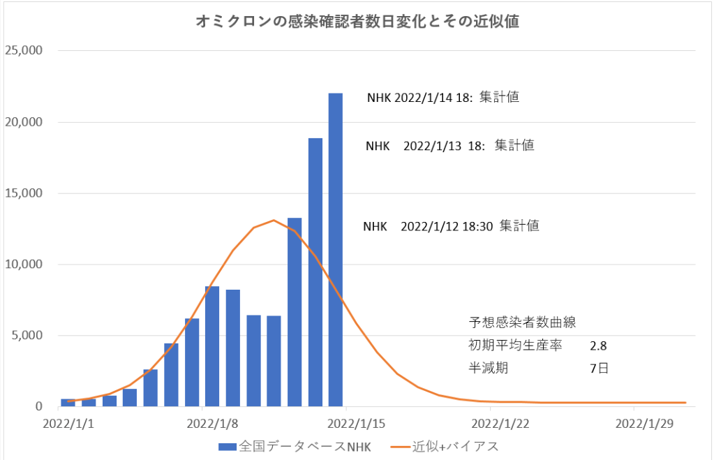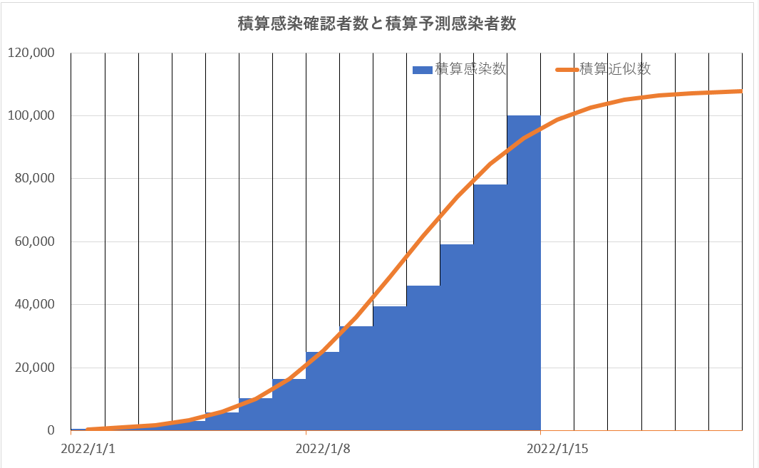 そこで、オミクロン感染が始まったと考えられる今年の1月1日よりの積算感染確認者数と、予想感染者数の日毎積算値の増加曲線を比べてみた。