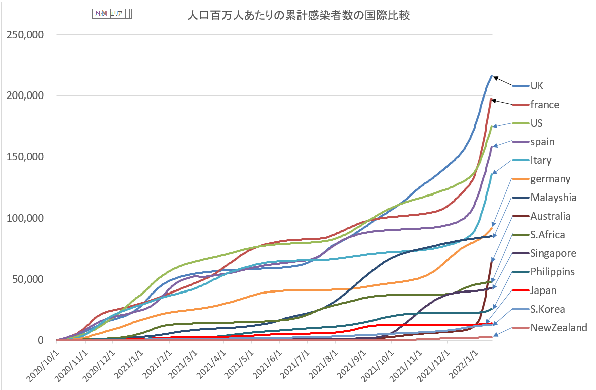 OWiDの集計データベースから描いた人口百万人当たりの累計感染者数。欧米の感染者数はアジア諸国のほぼ十倍。また、オミクロン株と云われる今回の急激な感染者増が顕著に見られる。