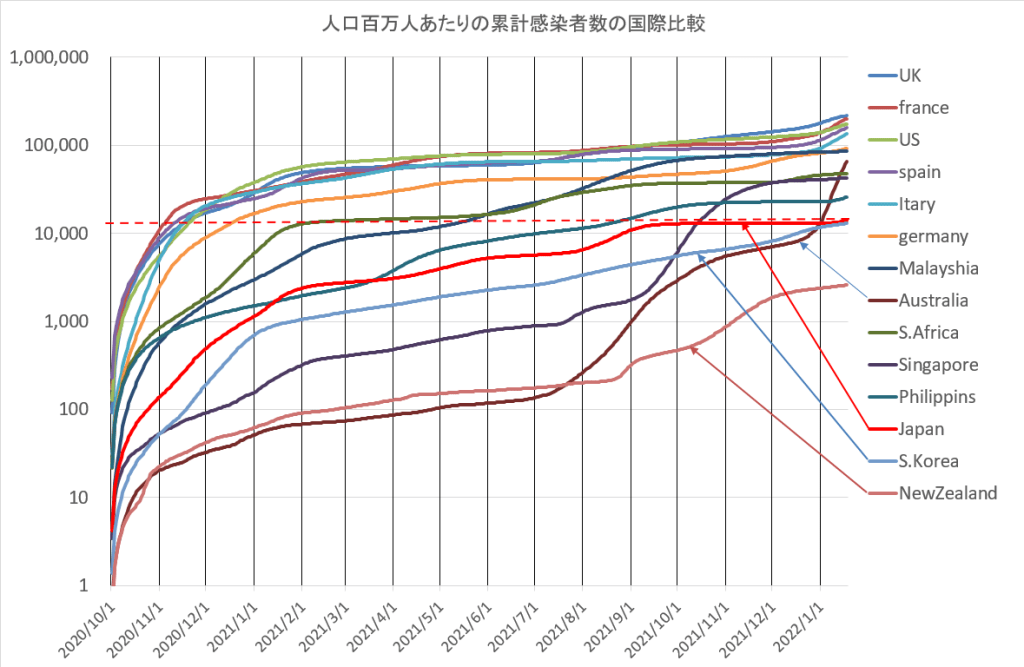 昨日18日時点の日本の累計感染者数を点線で示した。このベルを欧米諸国が超えたのは、すでに2021年1月以前である。さらに、今のところ欧米諸国に見られるオミクロン増加もグラフに現れるほど大きくない。