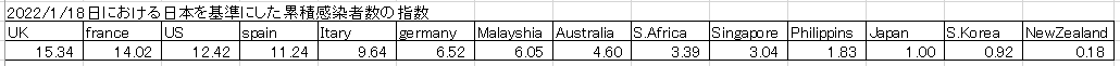 下は、日本を1とした2022/1/18日に於ける累計感染者指数を表にしたものである。