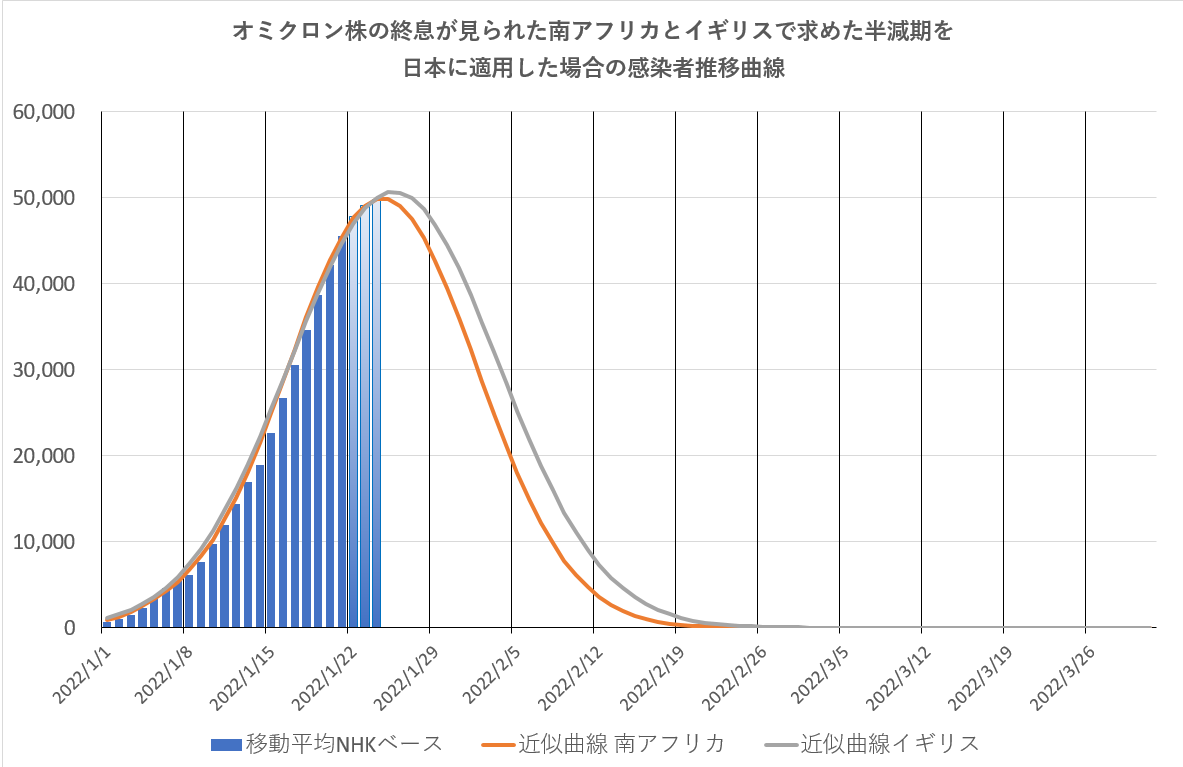 半減期の値は、世界でオミクロン感染者収束のほぼ終わった南アフリカとイギリスについて感染者の推移に適合する値をグラフから求めたもので、数式は論理的なモデルとは言えないが。