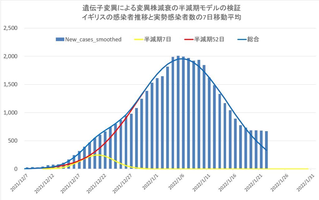 イギリスの日ごと感染者数の7日移動平均の推移から半減期を推定した様子で、イギリスに持ち込まれた変異株は2回あったと推定した場合である。その一つは感染増加初期の半減期が短い(7日)と、おそらくオミクロン株であろう半減期52日程度の主力感染株であったと見える。
