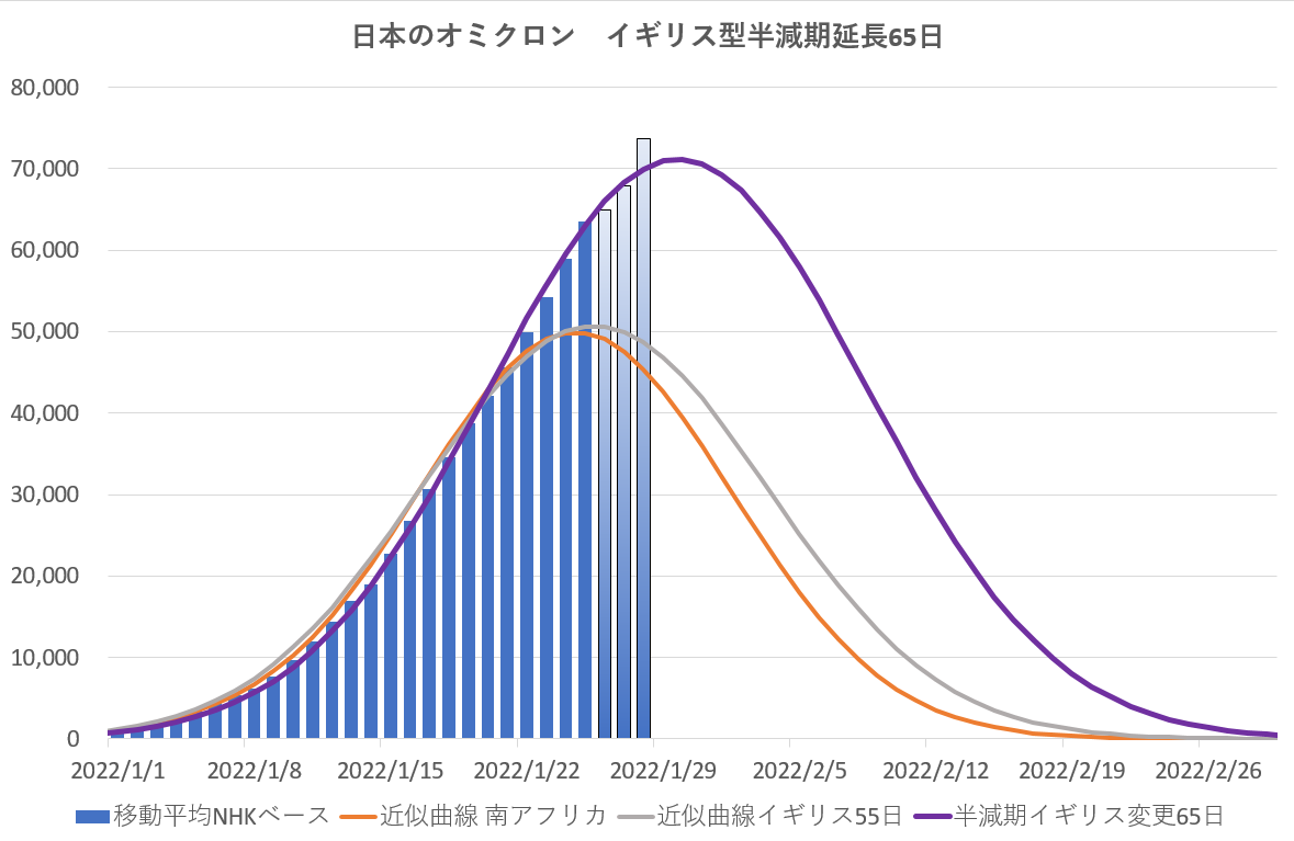 イギリス型感染曲線の最適近似値より求めた変異ゲノムの半減期55日から65日に延長した場合、日本の感染確認者数との比較。棒グラフは、日毎感染確認者数の7日移動平均値をその区間中央日に記入したもの、グラディエーション棒は直近後ろ向きだけの平均値。