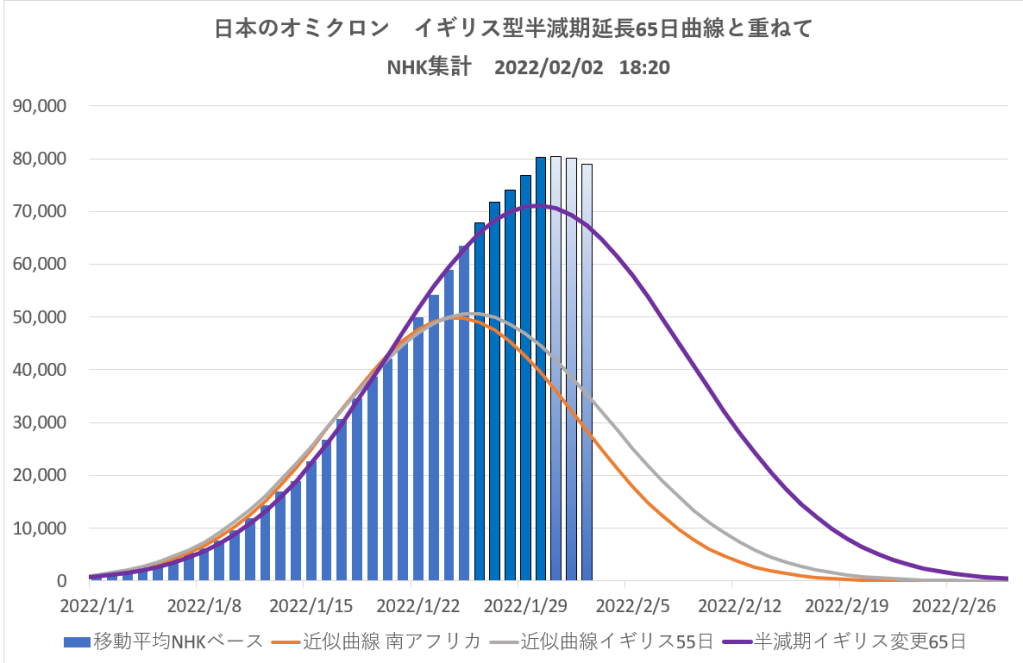 日本のオミクロン、イギリス型変異株、半減期65日モデルと比較して見る。