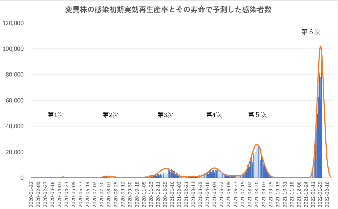 下のグラフは、日本の感染確認者爆発の各変動毎に近似した変数で描いた感染数曲線を重ねたものである。