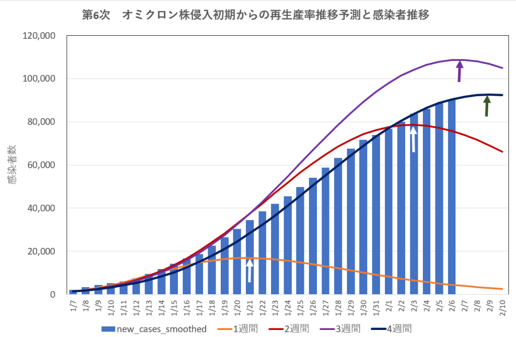 観察の期間が延びるに従い感染者数の峠までの期間が延び、最高感染者数も増加していることが分かる。これが初期の感染予想が外れ続けた原因である。矢印は感染者数の峠を指す。