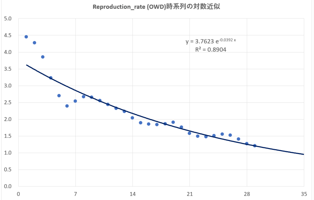 下のグラフは、OWiDに公表された再生産率(reproduction_rate)の日経過変動とその指数関数近似曲線を示したものである。1)