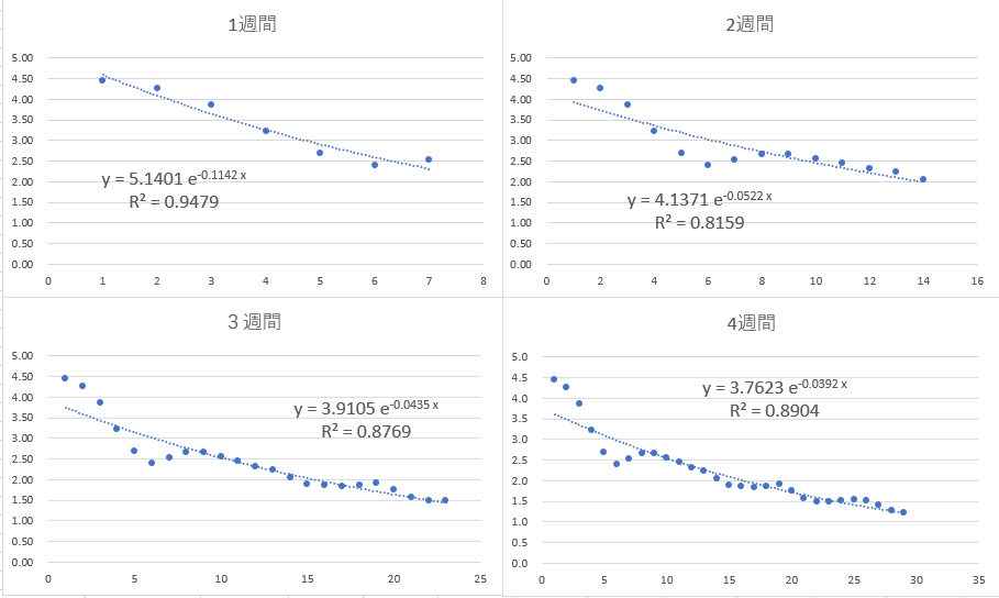 したがって、最初の1週間、から4週間までの期間についてそれぞれ指数近関数を求めた様子が次の組みグラフである。