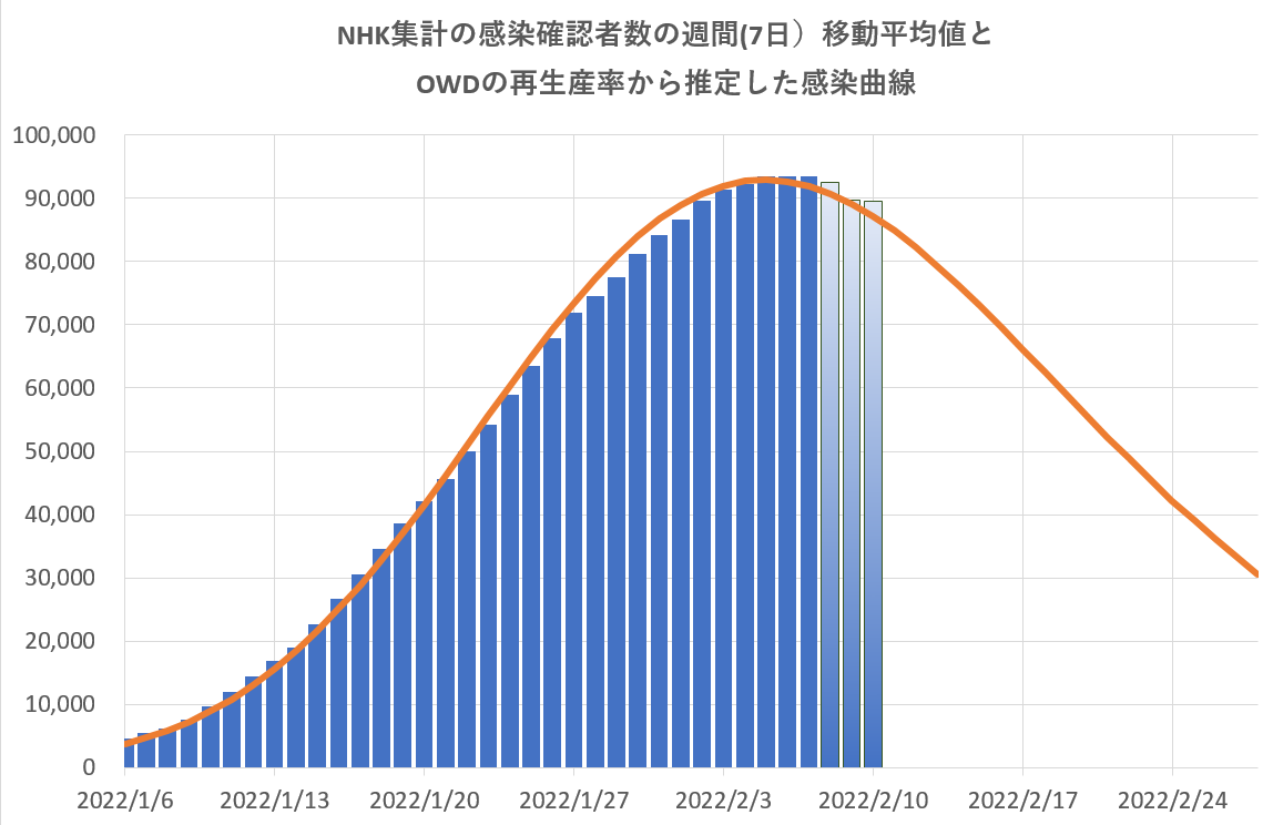 日本の現状、週移動平均値がやっと水平に、それに次ぐ後ろ向き平均値でも下降の傾向が(グラディエーション棒)、オレンジ曲線は変異ウィルスの減衰モデルによる感染者数の近似推移。半減期18日の場合。