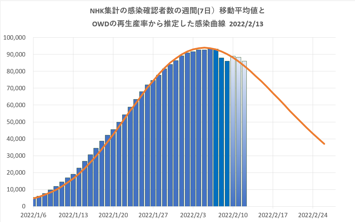 下に、NHK集計の日ごと集計値の週(7日)移動平均と近似感染者数曲線を重ねてたグラフを示す。
