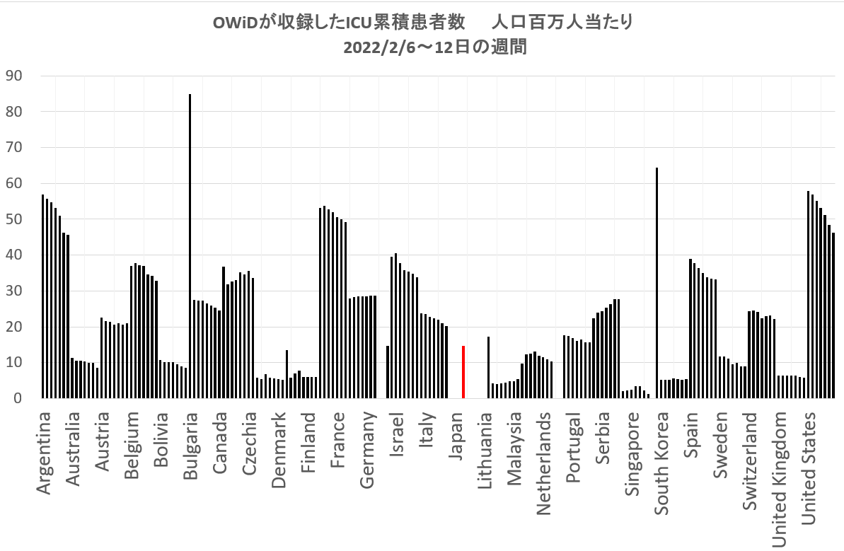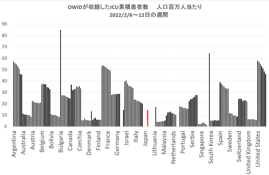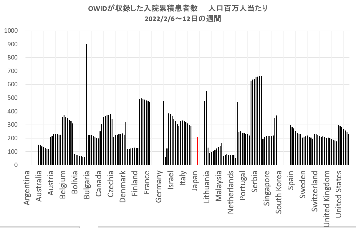 下のグラフは、OWiDによる2022/2/6日からの1週間に病院の医療状況を集計したものである。