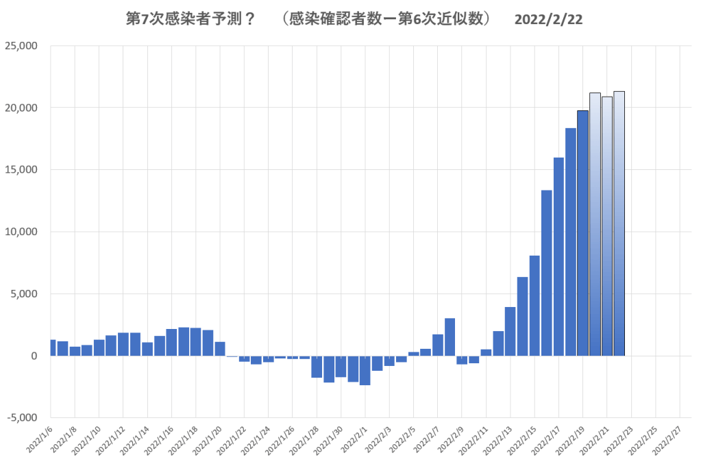 第6次感染確認者予想曲線からの余剰感染者数週移動平均値。第7次感染とも見える感染者数。