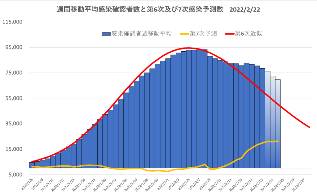 実勢週間確認感染者数と第6次、第7次感染予測数曲線との関係を描いてみた。