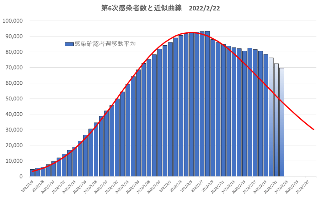 今日18時30分、NHK発表の感染者確認数による週間移動平均と第6次感染者推定数曲線。