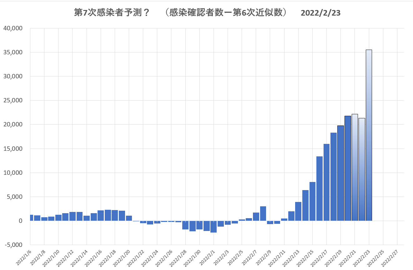 今日発表された昨日までの感染確認数の収録は急増、今日は祝日、明日の集計値は減ると思うが。