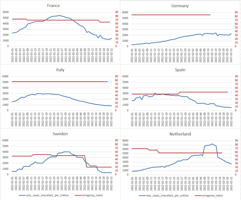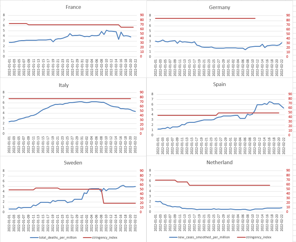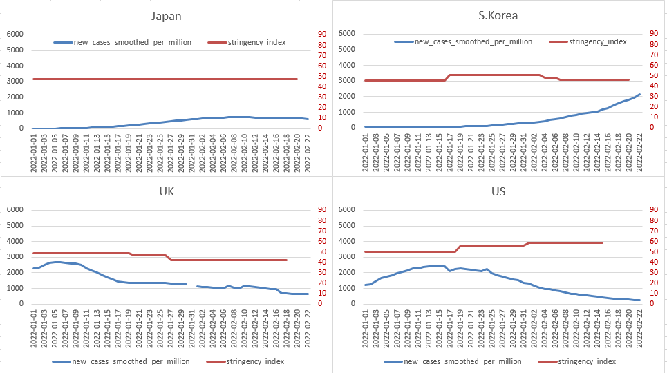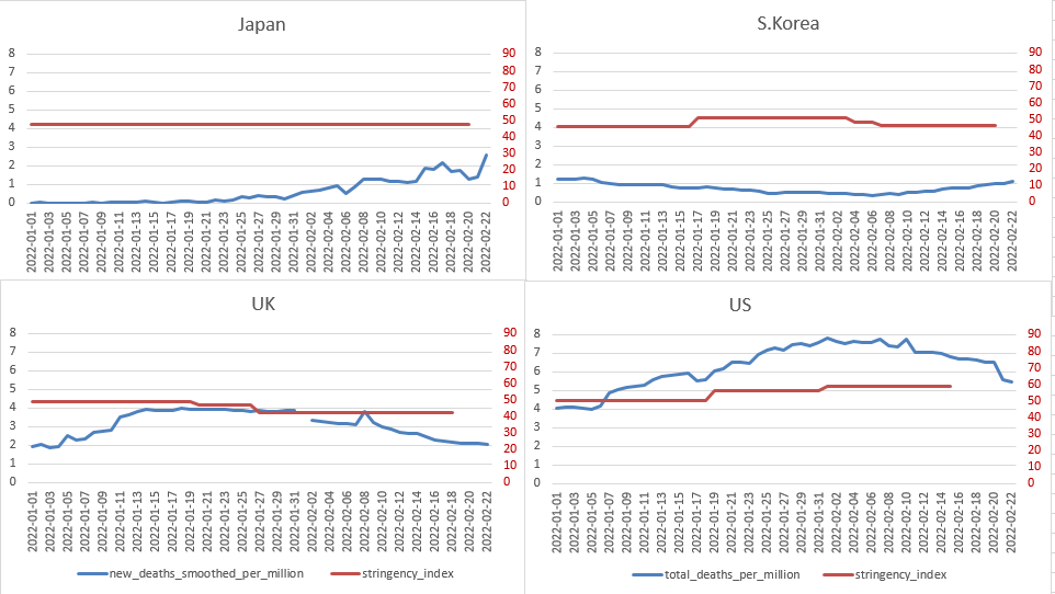 防止策そのものの社会的制約の度合いを共通の視点で比較するのは不可能だが、OWiDデータベースのstringency_indexと幾つかの北半球の国々の2022年に於ける感染確認者数、死亡者数時系列を(何れも人口百万人あたり)で比較してみた。