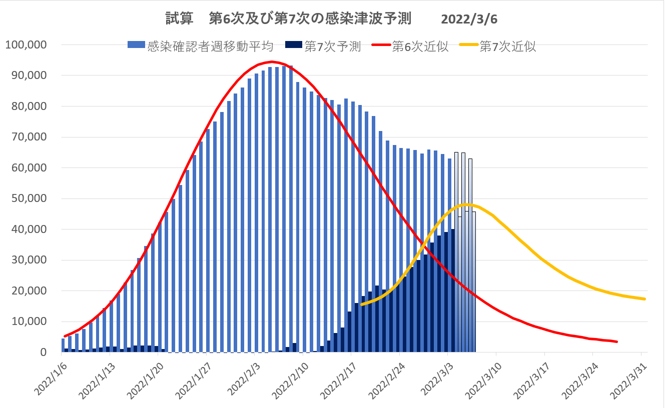 ゲノム変異に基づく第6次と7次と見られる変異株の実効再生産率の減衰を想定し、感染予測試算のグラフを描いてみた。