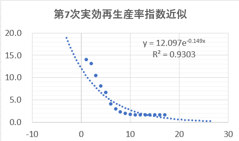 計算に用いた仮想再生産率推移。丸印は第7次予測感染者数から求めた実効再生産率、点線はその指数近似。