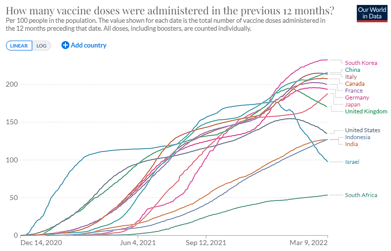 ワクチンの治験審査結果を疑いその効果を否定するわけではないが。社会活動や対人関係の習慣を含む実社会の生活での平均統計では感染防止効果は直接見えてこない。幾つかの国で比較した以下の二つのグラフはその一例である。